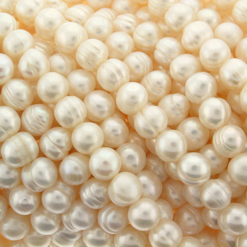 7-8mm White Freshwater Pearl Bead Strand. These cultured freshwater pearls have a nice luster, mostly uniform in shape, many with rings and ridges.