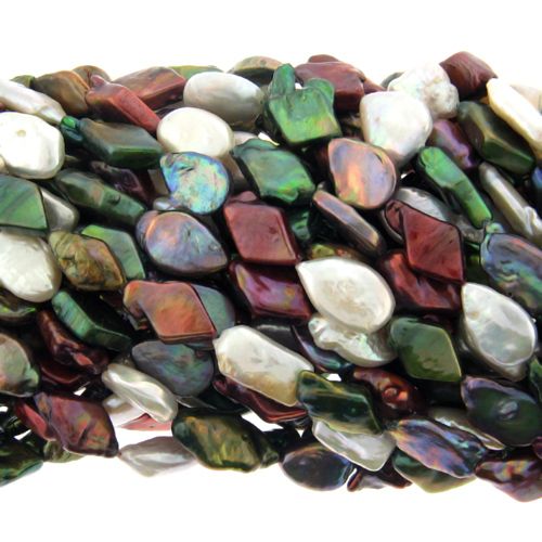 Home Up Back Next Multi-Color /Shape 13-20mm Freshwater Coin Pearl Bead Strand Mult-Color and Shape 13-20mm Freshwater Coin Pearl Bead Strand. These freshwater coin pearls have a variety of shapes: diamond, rectangle, oval, teardrop, clover, and round. Good luster and color depth.Sold by the 16 inch bead strand. Pearl bead dimensions: size ranges from 10mm to 13mm. Made in China.Quality cultured freshwater pearl beads always guaranteed.