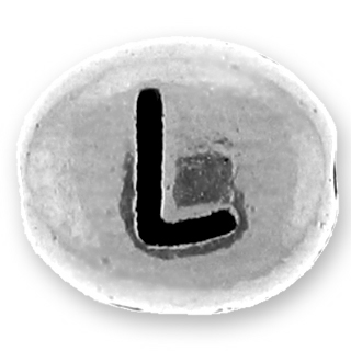 Silver/Rhodium Plated Oval Pewter Letter Bead L. Quality alphabet beads always guaranteed. Sold by the individual letter bead.Bead dimensions: 6.8mm length, 6mm width.Made in USA.Lead free.